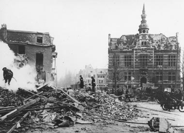 Het centrale gebouw is het vroegere Oud Gemeentehuis. Uit de vlammen en het puin haalt een moeder haar overleden kind. Het kind draagt een zomers kleedje, onschuldig, levenloos. De moeder stapt verloren uit het tafereel, van de wereld af. De zon is nu bloedrood: mensen zoeken op de achtergrond naar overlevenden.
